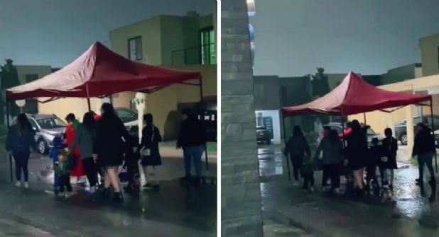 En una demostración de cariño y pese a la lluvia, mamás salen con lona para pedir calaverita con sus hijos en Nuevo León.