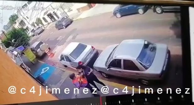 Las imágenes muestra como la víctima se encuentra caminando tranquila por la acera de una vialidad; momentos después se observa a un hombre, con chaleco naranja antireflejante, caminando detrás de ella, observando sus movimientos y sacando su arma de fuego. En un momento corre para alcanzarla y la toma por la espalda, exigiendo el bolso donde llevaba su dinero.