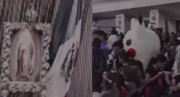 Claro, se trataba solamente de una botarga, la cual contenía dentro al joven creyente de la madre de Dios, quien seguramente quería acudir infundido en este traje para alegrar a los niños feligreses en el lugar.