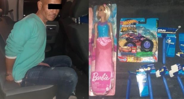 Cuando se le realizó un cateo a Carlos Alberto B. se le encontraron entre sus pertenencias dos muñecas tipo Barbie, un carrito HotWheels y ocho rastrillos, todo el conjunto con un valor a los 800 pesos, motivo por el que quedó detenido.