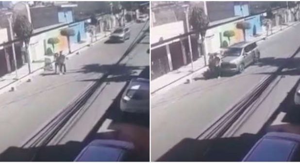 Las imágenes muestra como la chica es aventada hacia un lado del camino por el impacto, mientras el joven queda debajo de las llantas del vehículo, siendo arrastrado varios metros adelante.