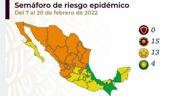 Además, en el color amarillo, que significa un riesgo medio de contagio de coronavirus, pasó de 10 entidades a 13. En este nivel se encuentran la Ciudad de México y el Estado de México, y se mantendrá hasta el 20 de febrero.