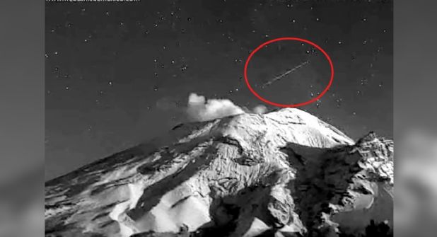 Un meteorito que paso sobre el volcán Popocatépetl la madrugada del 16 de marzo, alrededor de las 5:25 horas, la imagen fue captada por las cámaras de webcams de México, en donde se observa el paso del objeto luminoso pasar justo en la parte superior del coloso.