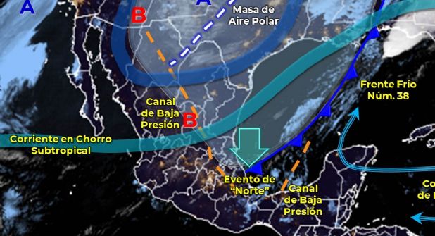 El frente frío 38 se va desplazar sorbe el sureste del país provocando lluvias fuertes en Chiapas, Puebla, Veracruz, Oaxaca, Tabasco y Campeche.