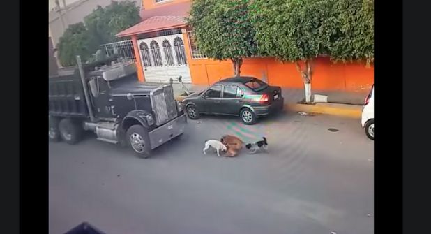 El video que circula en redes sociales se ve al grupo de perros que se encuentran jugando en medio de la calle. De pronto se ve que se acerca un tráiler, y parece como si fuera a frenar esperando a que se quiten los perritos, pero no, todo lo contrario, sigue con la marcha y la pesada unidad les pasa por encima.