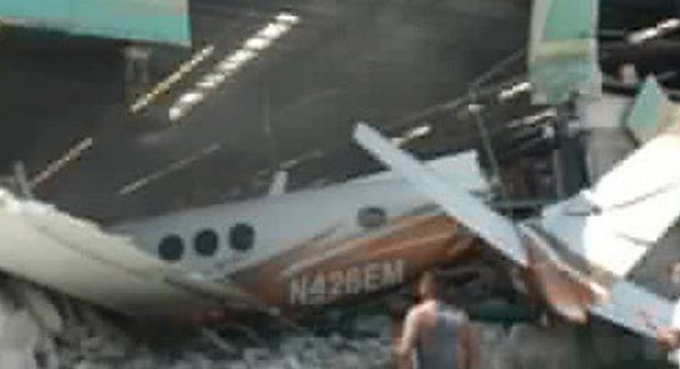 Las imágenes muestran como la aeronave atravesó de forma lateral al inmueble, entrando de lleno y destrozándose en el camino.