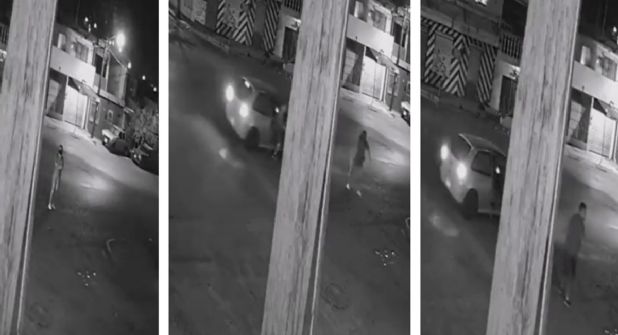 Sin conocerle y asustada, la mujer inmediatamente esquiva al sujeto y huye del lugar hasta desaparecer de la cámara de vigilancia que se encontraba en la calle. Por su parte, el hombre intentó correr; sin embargo, metros adelante se frena y regresa al vehículo junto con su cómplice.