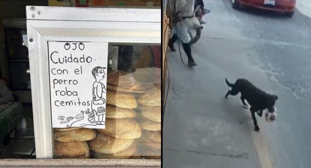 El letrero puesto en el establecimiento fue compartido en redes y en el mismo, se les avisa a los clientes de tener cuidado con el perrito que ronda por el lugar y se dedica a robar cemitas que compran.