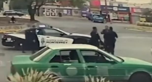 Por el lugar, personas que pasaban en autos se quedaron viendo el show que hicieron varios policías de Monterrey que protagonizaron una pelea, pero no contra delincuentes, sino entre ellos mismos, y todo quedó captado en video gracias a la cámara de seguridad de un negocio.