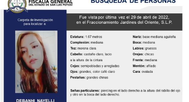 SAN LUIS POTOSÍ.- En San Luis Potosí se emitió una ficha de búsqueda para trata de localizar a una joven de 24 años, desaparecida desde el 29 de abril. Su nombre es Debanhi Nayelli Salazar Martínez.