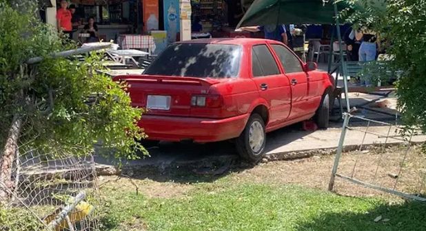 Cámaras de seguridad captaron el momento, en el que un vehículo rojo derribó la malla ciclónica que rodea la universidad y los estudiantes son alcanzados por el automóvil, luego de que comían en unas mesas.