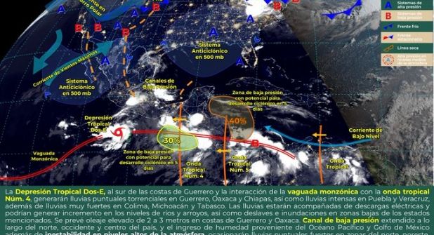 CIUDAD DE MÉXICO.- Las lluvias seguirán en algunos estados del país debido a fenómenos que podrían convertirse en huracanes en los siguientes días. Dos se ubican en el Pacífico y uno más en el Atlántico.