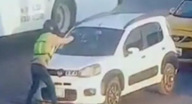 En las cámaras de seguridad se observa que un auto llega y se detiene, de pronto una persona que viajaba en moto se para frente al vehículo y dispara en varias ocasiones contra el auto.