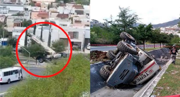 En redes sociales circula un video donde se ve a una grúa fuera de control que terminó volcándose en un canal, en la colonia Colinas de Huajuco, en Monterrey.