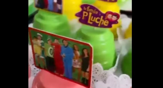 No solamente los asistentes se vistieron con dichos atuendos, sino toda la fiesta fue realizada con la temática del programa, luciendo desde servilleteros forrados de peluche, gelatinas con imágenes de la serie, un pastel de ‘peluche’ y hasta una pared verde con el logo fueron captadas en este clip.