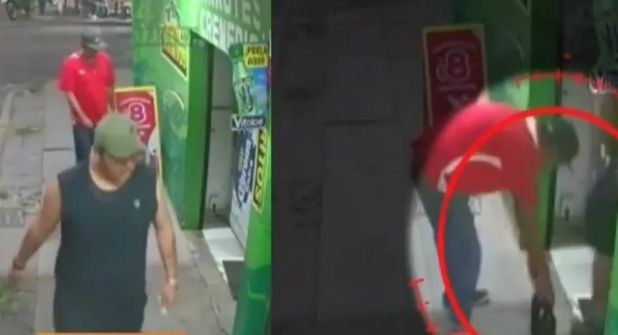 En el video que circula en redes sociales, se aprecia el momento en el que a una tiendita se acercan dos hombres de entre 35 y 45 años. Uno le dice al otro que lo espere afuera de la tienda. Mientras uno se mete al local. Pasan unos segundos y sale por otro lado, y le da un instrucción al que quedó afuera.