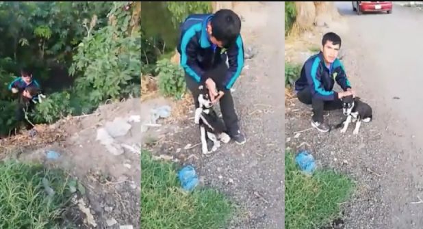 Fue así como el hombre a regañadientes hace caso a las peticiones y tras una corta caminata toma al animal del suelo y lo lleva hasta la orilla de la carretera, al acercarse se puede ver que el animal estaba amarrado por el cuello, así como de sus cuatro patas, tras unos segundos de lucha, finalmente el animal queda libre.