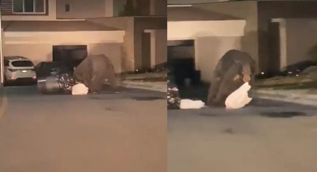En una colonia de Nuevo León, un impresionante oso negro fue captado en video buscando alimento en las calles.