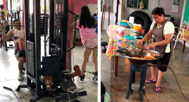 Como si se tratara de una deliciosa tortura, una vendedora de antojitos instala su puesto de sopes dentro de un gimnasio.