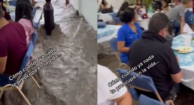 El material fue subido por el usuario identificado como @netzamagallon, y en el mismo se puede observar que un festejo continuo mientras debajo de las mesas y sillas circulaba una fuerte corriente de agua con lodo.