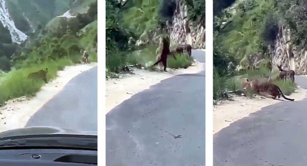 Mientras el hombre grababa a los asnos desde el interior de su vehículo, entre el pastizal salió de manera intempestiva un enorme felino moteado que se fue directamente contra uno de los animales.