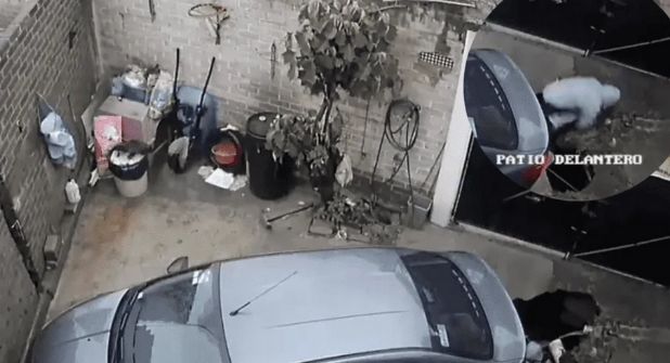 A través de una cámara se aprecian las imágenes en las que un hombre sale al patio y observa el hoyo que se formó. Trae una lámpara. De pronto quiere rodear el socavón y el piso se vence, por lo que cae.