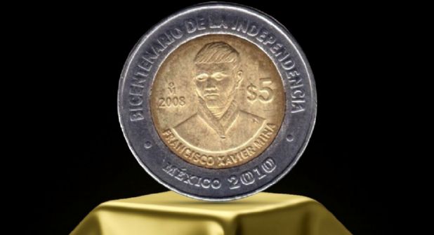 Se trata de la moneda conmemorativa del bicentenario de México con la imagen de Francisco Javier Mina, reconocido militar y guerrillero participante en la lucha de independencia de país y España, siendo sumamente apreciado por la rareza de su circulación en el público.