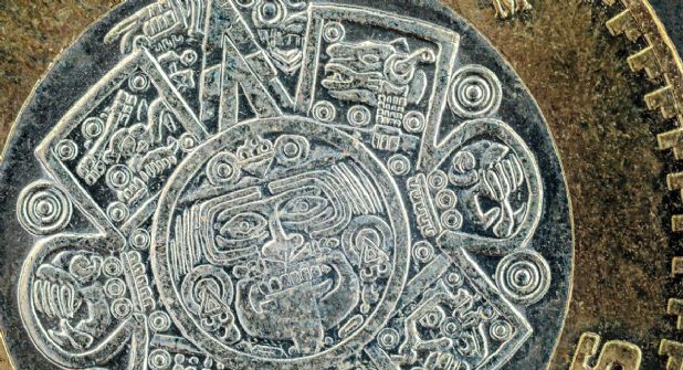 Se trata de la moneda de 10 pesos con la fecha de emisión de 2007, la cual pertenece a la familia C. En su cara frontal muestra el círculo de la Piedra del Sol que representa a Tonatiuh con la máscara de fuego. En el anillo perimétrico el símbolo "N$10", año de acuñación, símbolo de la Casa de Moneda de México "M°" y la leyenda "DIEZ PESOS".