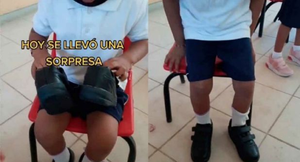 El video muestra el momento en que la maestra le da el obsequio a su alumno, quien agradecido la abraza con cariño y procede a probarse sus nuevos zapatos.