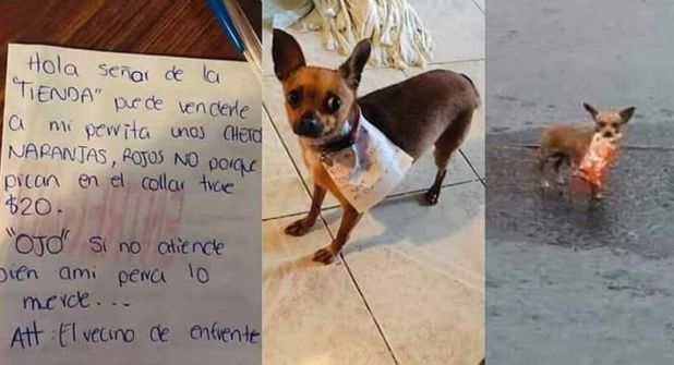 Su sistema es colocarle a su perrita una nota dirigida al dueño de la tienda en su collar junto con un billete de 20 pesos para qué el comerciante entienda el trabajo de la chihuahua.