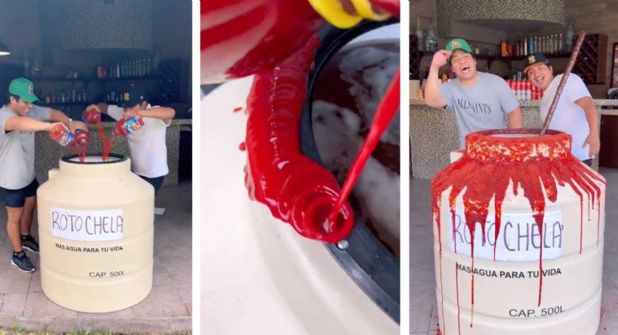 Después de terminar de vaciar los componentes, los hombres procedieron a mezclar la bebida con unas enormes palas y embarrar el chamoy y el chile piquín alrededor del cuello del Rotoplast, que empezó a deslizarse por las paredes exteriores del tanque antojando a quienes veían el video.