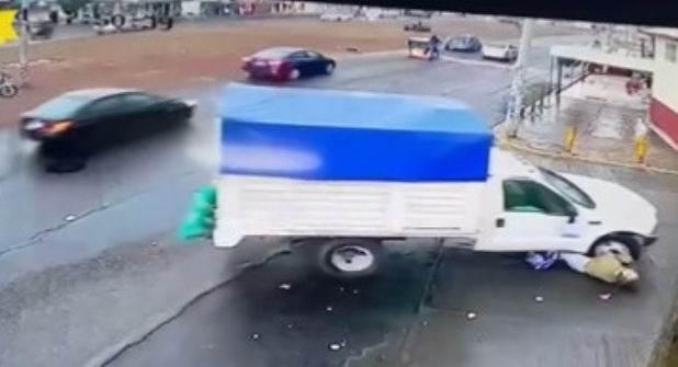 En las fuertes imágenes se observa que con la parte delantera derecha de la camioneta arrolla y atropella al hombre. La llanta delantera le pasa por encima de la pierna derecha.
