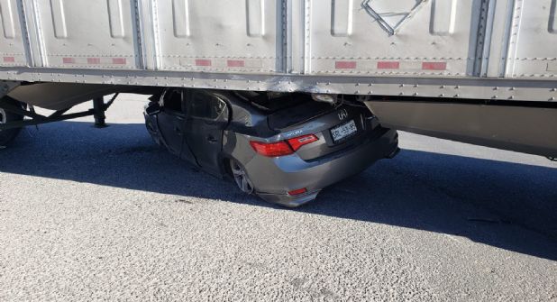 Vivo de milagro terminó el conductor de un auto Acura en Ramos Arizpe, Coahuila, después de que chocó contra el remolque de un tráiler y quedara debajo de éste.