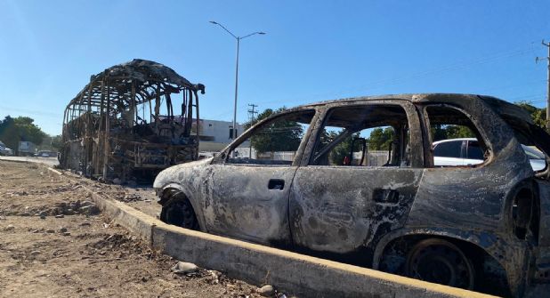 Cenizas, hollín y la simple estructura de autobuses y vehículos de particulares fue lo único que quedó esta mañana en las calles de Culiacán, Sinaloa, tras los bloqueos por la detención de Ovidio Guzmán.