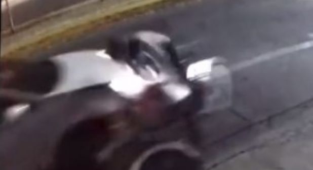 Luego de ser impactado de frente, se puede observar como una camioneta, de color blanco, gira un poco a la derecha para centrar al tamalero y a baja velocidad deja ir toda la máquina contra el comerciante y su frágil vehículo.