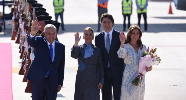 Trudeau bajó del avión oficial acompañado de su esposa Sophie Grégoire, ambos fueron recibidos por el mandatario de México y su esposa Beatriz Gutiérrez Müller, quien le entregó un ramo de flores a la primera dama de Canada.