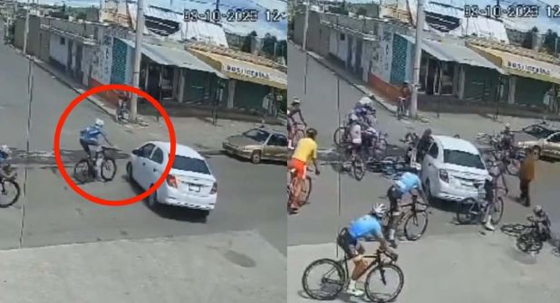En el video captado por una cámara de seguridad, muestra un grupo de ciclistas que se estrellan contra el auto compacto, cuyo conductor aparentemente desobedeció los señalamientos viales, lo que ocasionó interrumpir la carrera con este accidente.