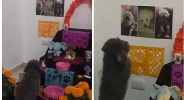 En este marco es que un tierno perrito fue grabado mientras observa la fotografía de quien fuera su mamá en vida, puesta en el altar de muertos justamente en el día que se cree las mascotas vuelven a ver a sus dueños.