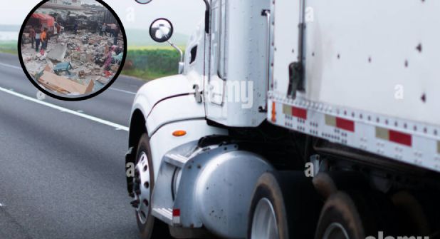 La carrera de un tráiler, propiedad del Circo Atayde, que se habría quedado sin frenos, tuvo un aparatoso final cuando terminó impactándose sobre varios vehículos y locales comerciales, a los que hizo añicos y terminó volcado sobre una carretera.