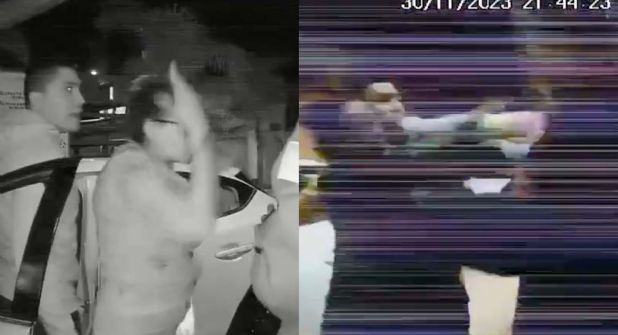 Un video de seguridad, pero sin ningún audio, muestra a una pareja de un hombre y una mujer que llegan hasta una caseta de vigilancia, posteriormente se ve el manoteo y una discusión verbal y cuando parecía que todo acababa la mujer que llegó en el vehículo comienza a golpear a la mujer que funge como guardia de seguridad.