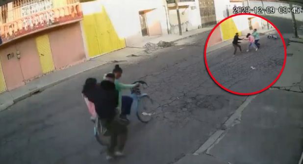 Las imágenes muestran como una mujer va en bicicleta junto con su hija, a quien transporta atrás de ella. En un momento, un hombre desde un auto en movimiento, se baja para comenzar a perseguirlas.