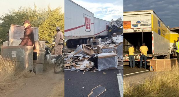 Un accidente de al menos 3 tráileres se presentó en la Maxi pista Mazatlán-Culiacán a la altura del kilómetro 80, entre el transporte de carga pesada afectados se encuentra uno de la empresa Coppel, el cual terminó con la caja destruida donde llevaba la mercancía, por lo que los artículos se salieron y personas aprovecharon el momento para llevarse electrodomésticos y más.