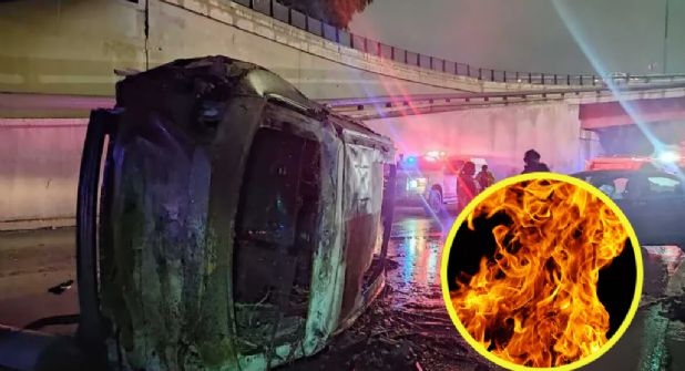 Aunado al pavimento resbaladizo por la lluvia, la camioneta se estrelló contra el muro de contención para posteriormente voltearse. Su camino descontrolado lo hizo impactar contra otro vehículo, dejándolo de lado y comenzando a incendiarse.
