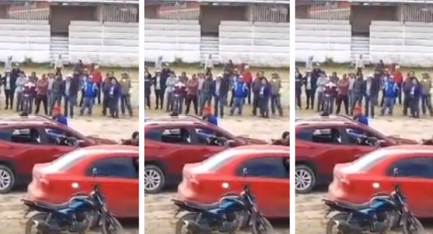 En un video difundido en las redes sociales, se observa un campo al que llegan los vecinos, que rodean dos coches rojos, la multitud se echa encima a hombres más próximos a los dos vehículos y empiezan los disparos.