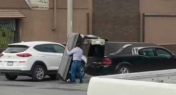 El hombre parecía avergonzado de que tantos ojos lo estuvieran mirando y con toda la pena del mundo recogió el ataúd de la calle y lo más rápido que pudo lo regresó a la carroza. Después de asegurar que la manija de la limusina estuviera perfectamente cerrada, volvió a subir al vehículo fúnebre.