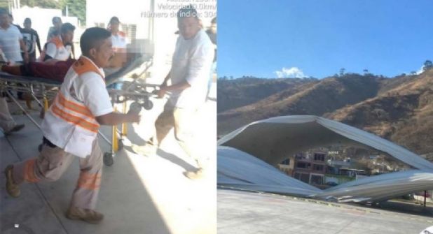 Una gruesa lámina de un domo deportivo, colapsó por los fuertes vientos y lesionó a 10 menores y a un adulto, esta tarde en Motozintla, Chiapas.