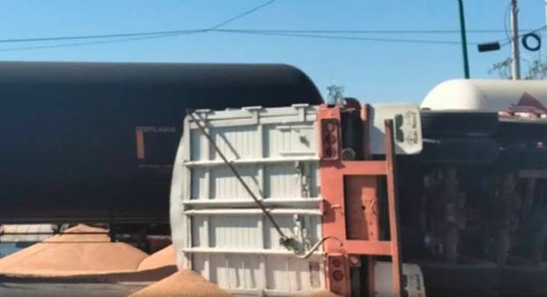 El tráiler que transportaba una carga de trigo fue golpeado de lleno en la unión de los dos remolques. El exceso de confianza en la potencia de su camión para cruzar rápido le hizo realizar un mal cálculo y no pudo completar la pasada del crucero de ferrocarril.
