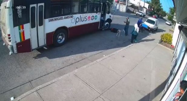 Debido al fuerte golpe, el hombre, identificado como Seferino de 81 años queda tendido en el piso, y no se mueve, mientras el chofer de la unidad detiene el camión y desciende para ver cómo se encuentra el hombre.