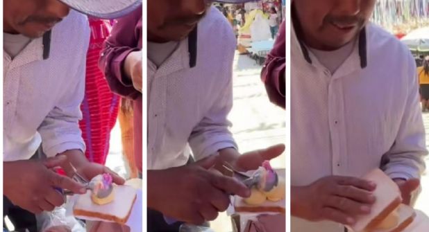 Don Agustín, quien lleva 10 años en este negocio, se encontró con unos turistas mexicanos en Putla, Oaxaca, en un día de fiesta en el que acudió a vender a este lugar. Ahí, Magy se encargó de grabar un postre que jamás había probado: sándwich de helado.