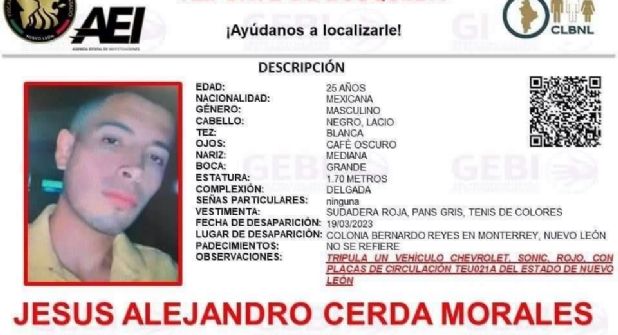 En la ficha de búsqueda se indica que Jesús Alejandro Cerda desapareció junto con su vehículo modelo Sonic Chevrolet en color rojo, con placas de circulación TEU-021-A. Sin embargo, se desconoce si las autoridades encontraron el cuerpo del ahora occiso junto con la unidad o si esta continua desaparecida.